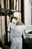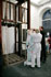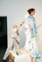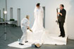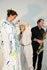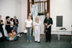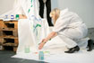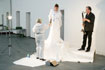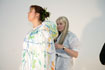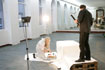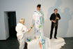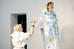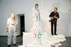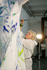 Die Sängerin ist Bemalungsobjekt und interagiert improvisatorisch mit der Bassklarinette und dem Farbauftrag der Malerin. Das Mantelkleid der Stimme fließt über das Podium, die Farbe rankt sich vom Boden bis zu den Haarspitzen, kommentiert von Tönen und Geräuschen. |