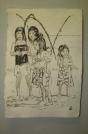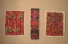 Red is the color of both love and war, conveying warmth as well as danger. The terms "reds" or "redskins" have been misused in both the political and ethnological sense. Many people also associate the color red with liveliness and beauty. The red paintings portray the culture of the inhabitants of the Amazon region. The manner in which they apply this color in their immediate environment is the underlying topic of the present artwork. The only immediate projection surface available to the rainforest inhabitants is their own body and, in particular, their faces. Fruits are opened to yield a red, powdery pigment, other plants secrete juices that enable the application of blue tattoos that require two weeks to fade. The feathers of parrots, toucans and aras are glued together with tree resin or pasted onto faces and limbs. This jewelry serves to enhance beauty, but also plays a role in hunting and combat. |