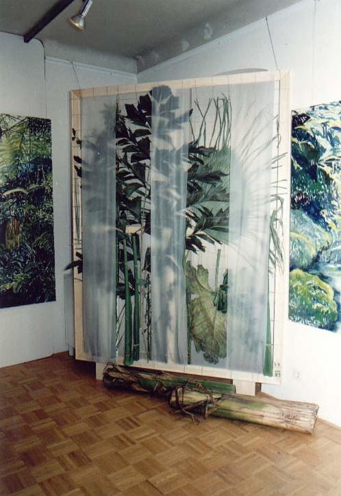 Primärwaldinstallation   Öl/Leinwand/Keilrahmen/Tapa/Spagat/Papier/Pflanzen, 1997